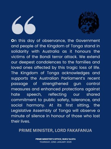 Media Release The Government and people of the Kingdom of Tonga stand in solidarity with Australia as it honours the victims of the Bondi terror attack today. January 23, 2026 Post navigation Previous: Prime Minister Lord Fakafanua received a courtesy call this morning from the Australian High Commissioner to Tonga, His Excellency Brek Batley. More Stories Media Release Prime Minister Lord Fakafanua received a courtesy call this morning from the Australian High Commissioner to Tonga, His Excellency Brek Batley. January 22, 2026 Media Release Prime Minister Lord Fakafanua met this morning with the Chair of the Public Service Commission Board January 22, 2026 Media Release Prime Minister Lord Fakafanua spoke on ODI Global’s Think Change podcast as a featured guest. January 22, 2026