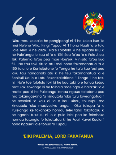 Media Release Prime Minister Lord Fakafanua’s statement on His Majesty’s Address at the Opening of the 2026 Session of the Legislative Assembly. January 16, 2026 Post navigation Previous: Prime Minister Meeting with UNDP Pacific Tonga TeamNext: Prime Minister, Lord Fakafanua met with members of the Tonga Chamber of Commerce More Stories Media Release The Prime Minister, Lord Fakafanua, was pleased to receive His Excellency Mr. Brody Sinclair, the newly appointed High Commissioner of New Zealand to Tonga February 6, 2026 Media Release The Honourable Prime Minister met with key stakeholders in Tonga’s energy sector February 6, 2026 Media Release Prime Minister Receives German Minister of Foreign Affairs, Reaffirming Longstanding Bilateral Relations. February 5, 2026